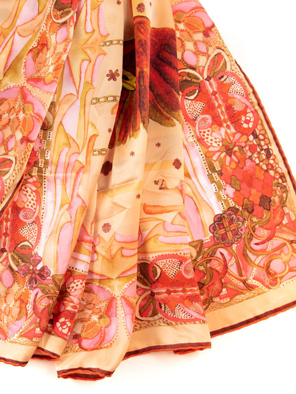 C’est une soie aux couleurs éclatantes que vous pouvez porter comme une étole sur une jolie robe ou près du cou pour tous les jours et qui vous tiendra chaud.